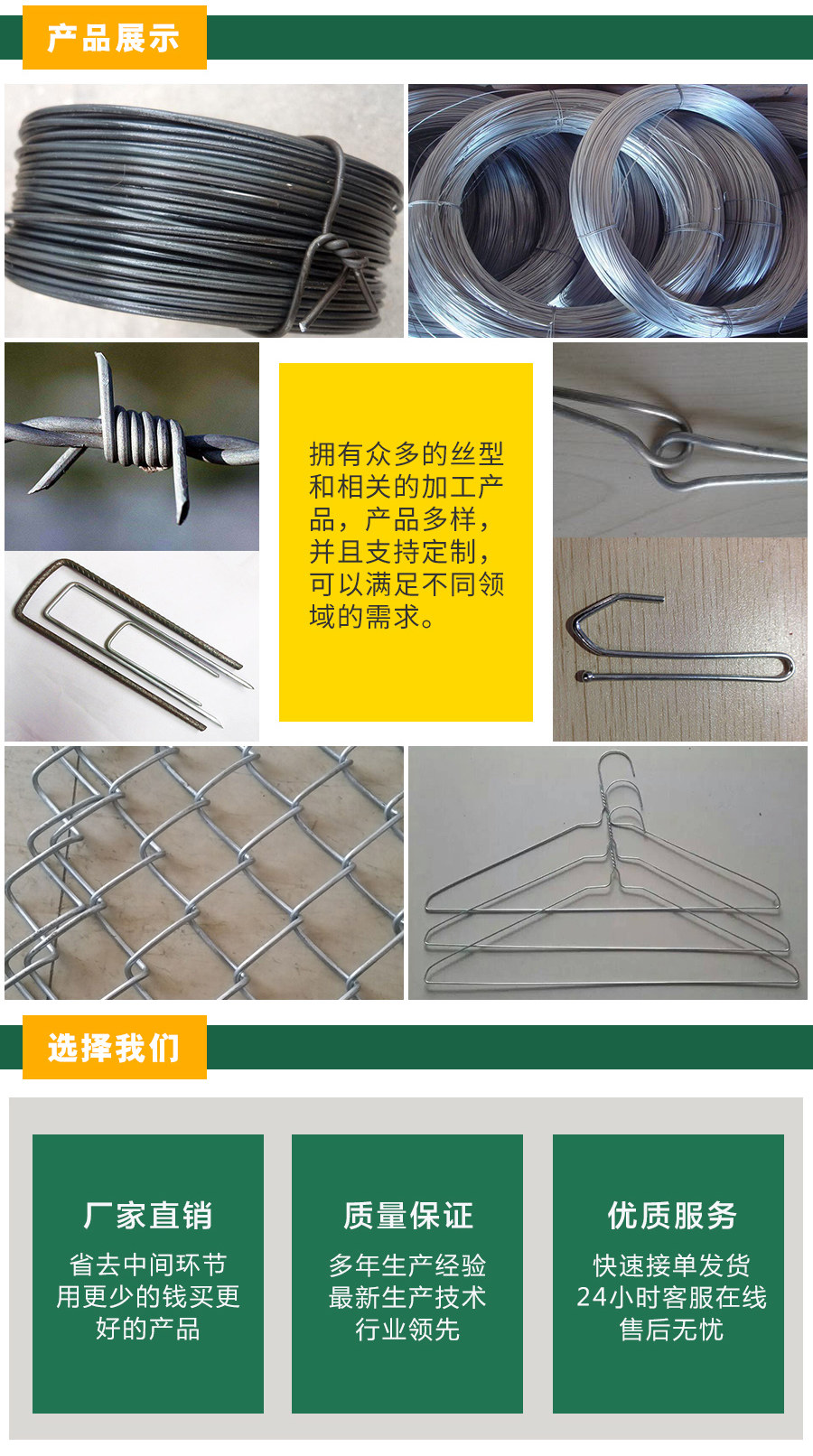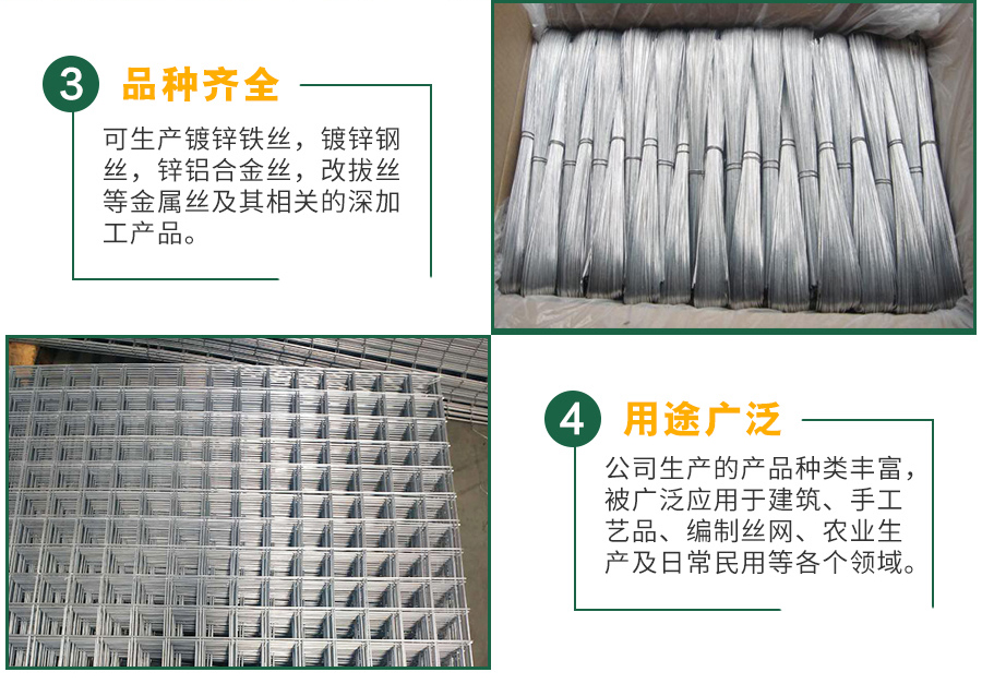 熱鍍高鋅鐵絲生產(chǎn)工藝:優(yōu)質(zhì)低碳鋼盤條經(jīng)過先進(jìn)的機(jī)械設(shè)備拔絲-退火-冷卻-酸洗-熱鍍鋅而成。