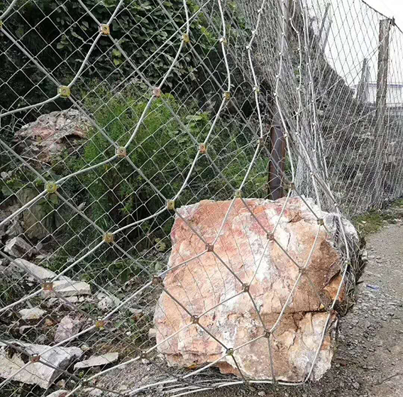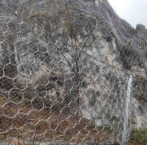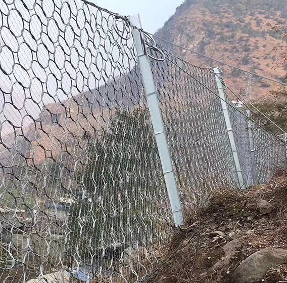被動(dòng)防護(hù)網(wǎng)是一種廣泛應(yīng)用于山地邊坡防護(hù)工程中的柔性安全防護(hù)系統(tǒng),其結(jié)構(gòu)主要由四個(gè)部分組成:鋼絲繩網(wǎng)或環(huán)形網(wǎng)(在需要攔截小塊落石時(shí),通常還會(huì)附加一層鐵絲格柵)、固定系統(tǒng)(包括錨桿、攔錨繩、基座以及支撐繩)、減壓環(huán)和鋼柱。這些構(gòu)件通過(guò)科學(xué)合理的布局與連接方式組合在一起,其中鋼柱與鋼絲繩網(wǎng)相互連接,形成一個(gè)穩(wěn)定而富有彈性的整體結(jié)構(gòu),從而對(duì)所需防護(hù)的區(qū)域?qū)崿F(xiàn)全面的面狀覆蓋防護(hù),有效阻止崩塌的巖石或土體從高處墜落,起到保護(hù)下方道路、建筑及人員安全的作用。